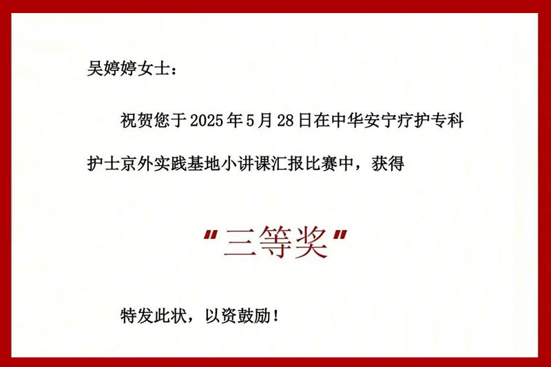 6月6日,杭州顾连上塘医院护士吴婷婷通过中华护理学会安宁疗护专科护士培训,成功获得专科护士资格证书,并于结业实践基地小讲课汇报比赛中荣获三等奖。查看详情>>